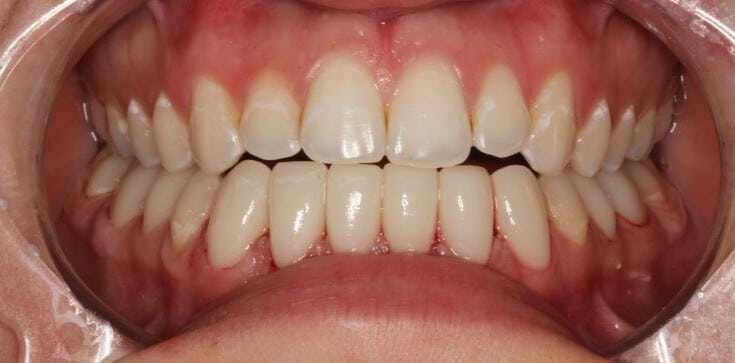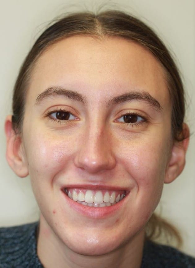 This patient came to see us due to a misalignment in her bite and some chipping and unevenness in her front teeth. To treat these issues, we used a combination of porcelain restorations and a fixed orthotic to straighten her smile and alleviate her misaligned jaw.